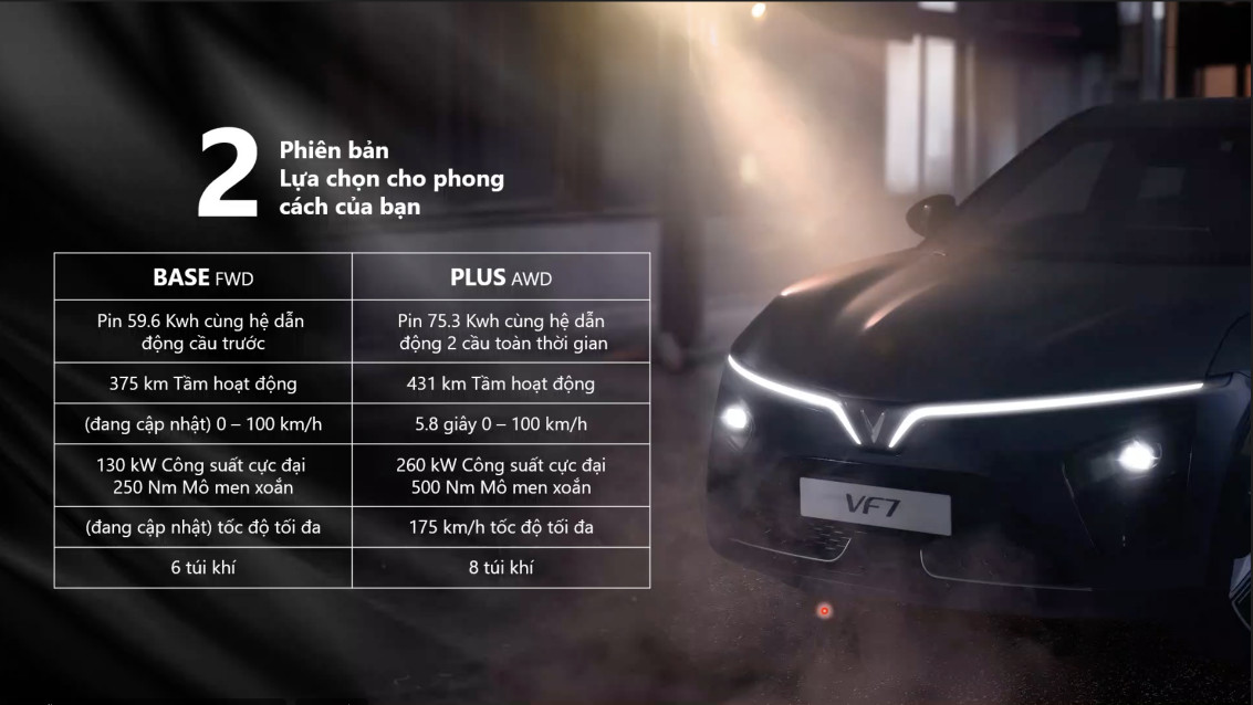 VF7 có hai phiên bản pin, trong đó bản tiêu chuẩn chạy được quãng đường 375 km, bản nâng cao di chuyển được 431 km cho mỗi lần sạc đầy.